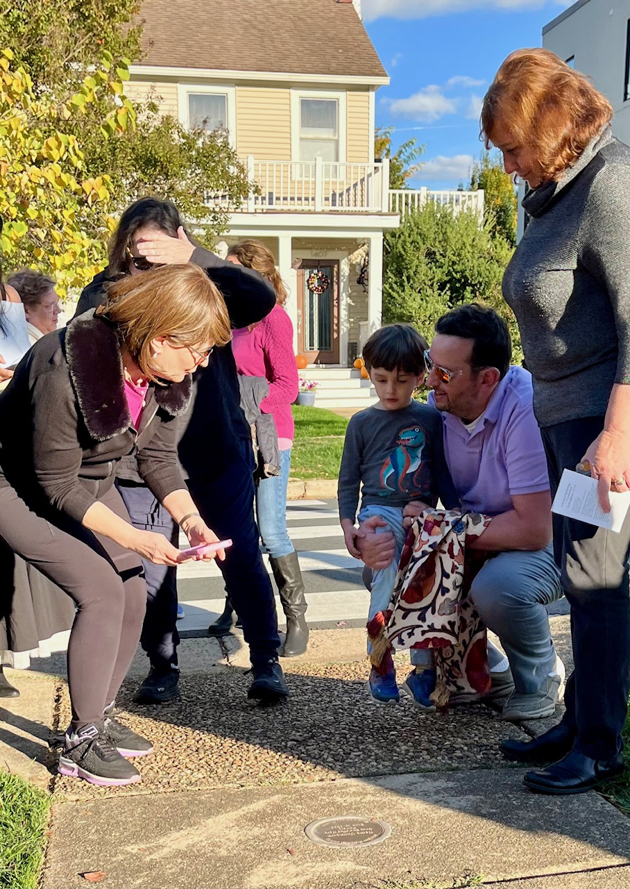 State Sen. Barbara Favola, left, photographs the Stumbling Stone in Lyon Village after its dedication ceremony and unveiling.