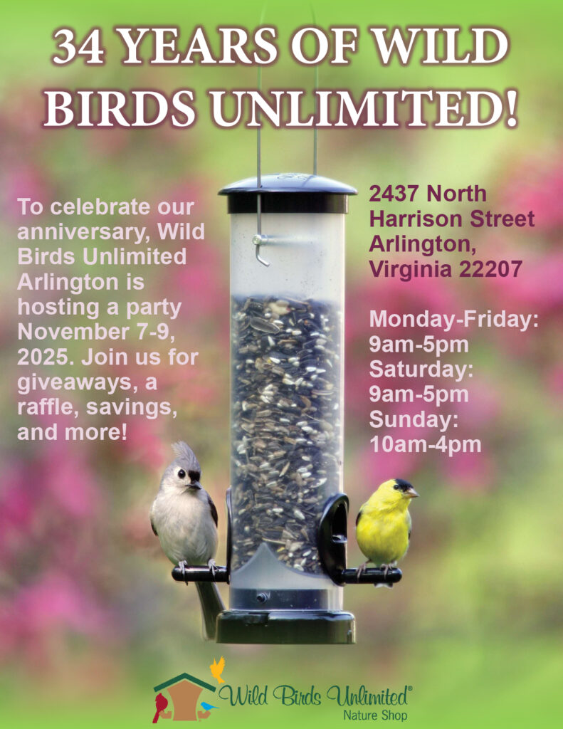Wild Birds Unlimited Arlington is celebrating 34 years of bringing people and nature together! Stop by the shop November 7th-9th for giveaways, a raffle, savings, and more.